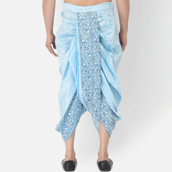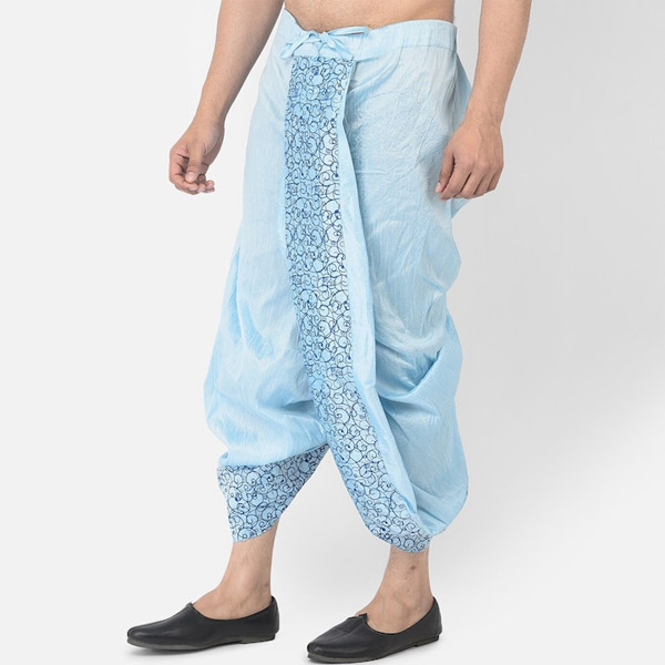 - A pair of blue printed dhoti pants with gathered and pleated detail, printed detail border, has an elasticated waistband, and drawstring closure